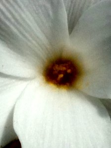 The yellow center of the rain lily. The three inner tepals are visible, backed by the outer tepals (two of which can be seen)