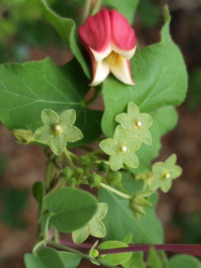 Seen here with the White leaf leather flower (Clematis glaucophylla), this small green flower with brown-red speckles has a center that is pearl colored.  What is even more surprising is the comparitively enormous pod that appears.  This type of seed pod is not uncommon in the family that this vine belongs to -Asclepidaceae.