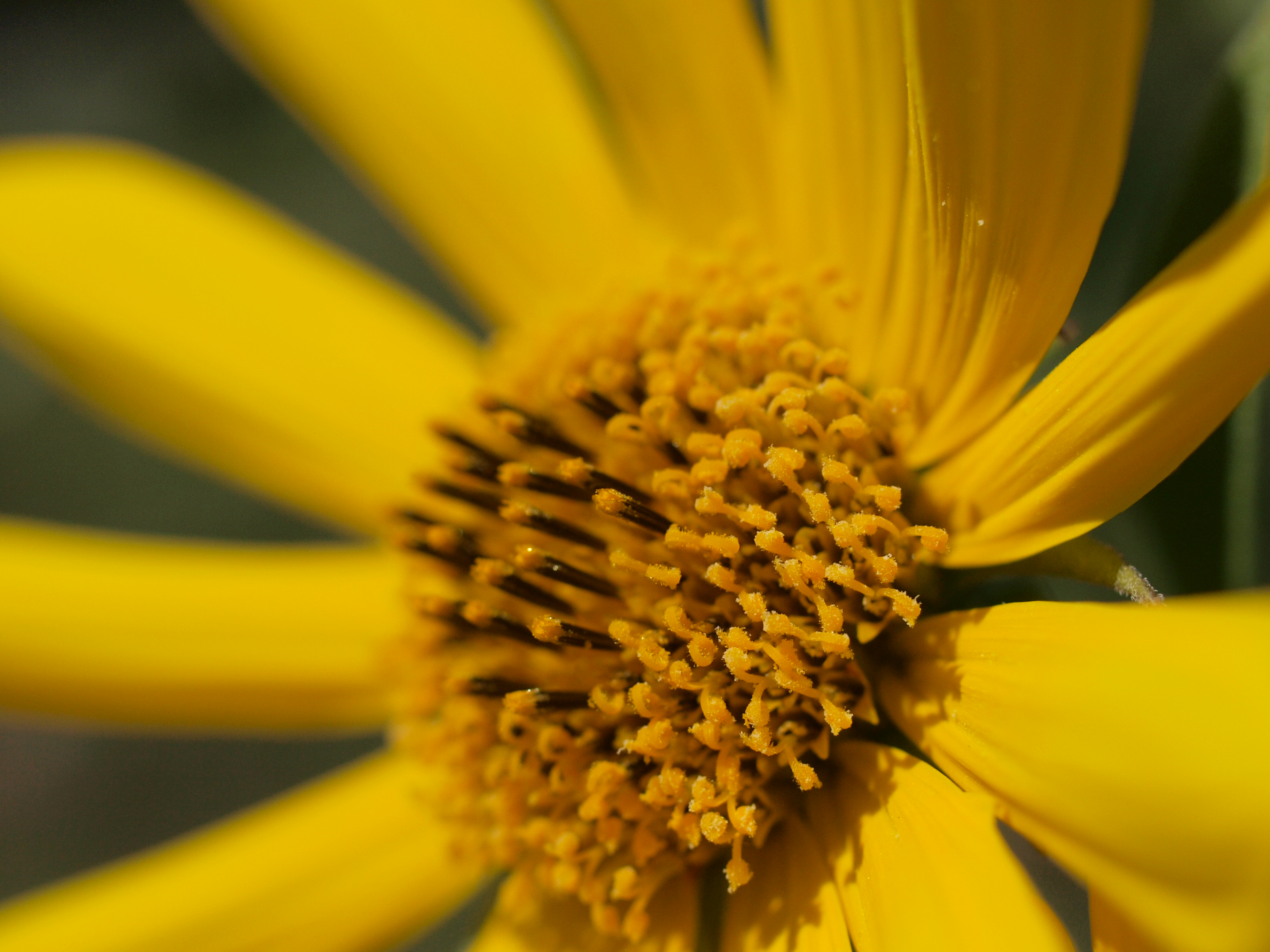 While most asters (or composites) are herbaceous perennial, biennials or annuals there are also shrubs and vines.  The complexity of this group extends to its taxonomy and you may see frequent name changes.  In fact you might see the family referred to as Compositae!  This name is in reference to the classic head inflorescence of the family.The flowers (disc florets) are typically collected together and surrounded by what are termed ray florets.  You might be tempted to call them petals but they are in fact a different type of flower to the others on the head.  In the image to the left you can see (from outside to center)the large yellow ray florets, the  yellow stigmas (female parts) of individual flowers and the brown anthers (male parts) in the center disc florets.